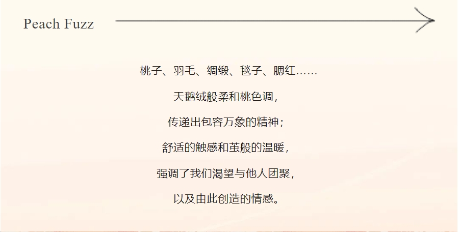 潘通色彩研究所行政總監表示,“PANTONE 13-1023柔和桃擁有舒適溫馨的蜜桃色調,柔和地依偎在粉紅色和橘色之間,除了帶給人歸屬感,激發我們去重新調整生活,尋找關懷他人的機會,并營造寧靜的氛圍,提供我們能置身其中、感受和療愈的空間。”