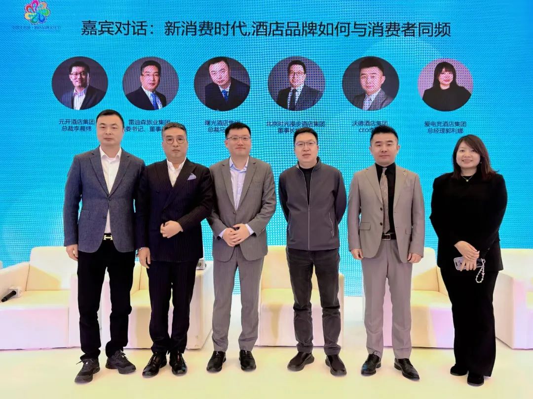 在“新消費時代,酒店品牌如何與消費者同頻”嘉賓對話環節,由元開酒店集團總裁李晨煒主持,雷迪森旅業集團黨委書記、董事長錢利,曙光酒店集團總裁馬立丹,北京時光漫步酒店集團董事長楊靜峰,沃德酒店集團 CEO 李鵬,愛電競酒店集團總經理郭利娜進行了討論。