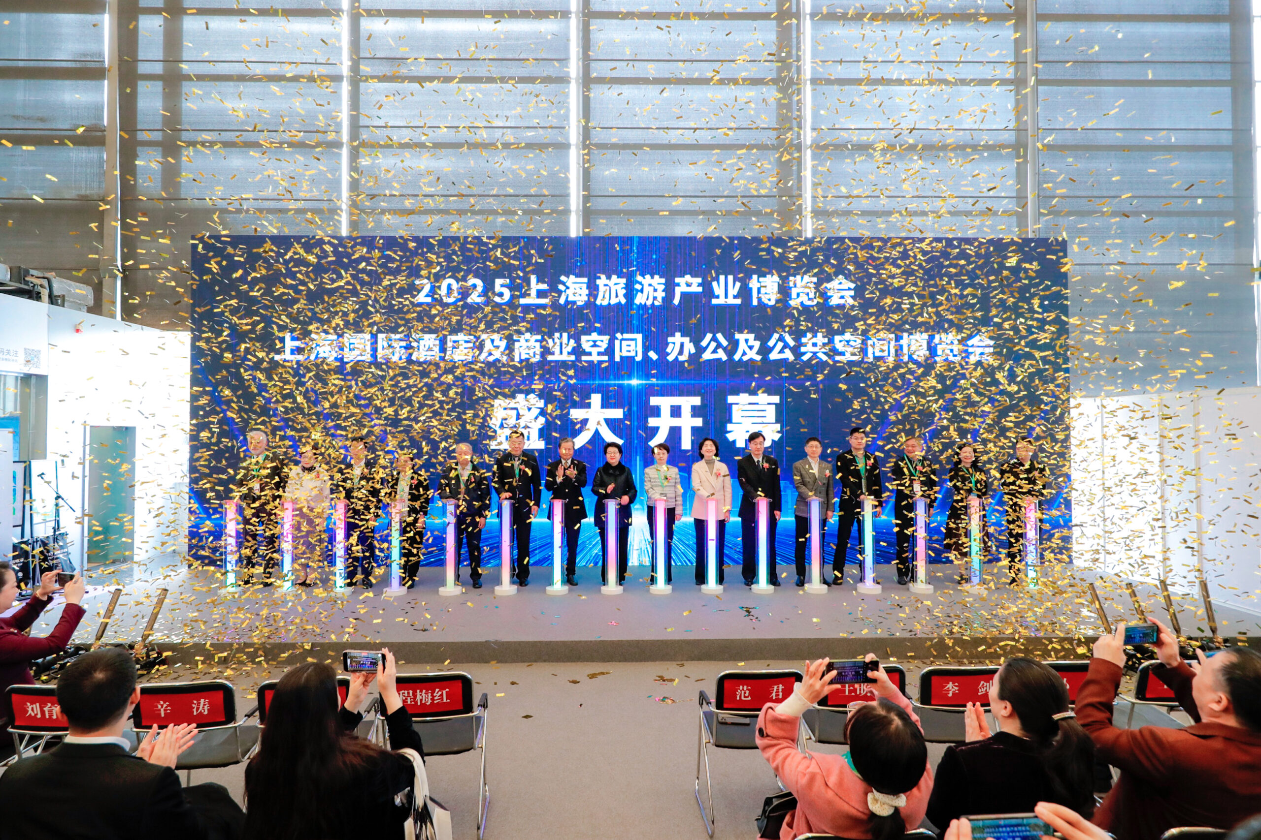 致辭圓滿結束之際,現場尊貴的嘉賓們共同見證了展會啟動儀式的璀璨瞬間,標志著2025上海國際酒店及商業空間、辦公與公共空間博覽會的盛大啟航!展館內外,人流如潮,絡繹不絕,共襄這場行業盛事的非凡開場!